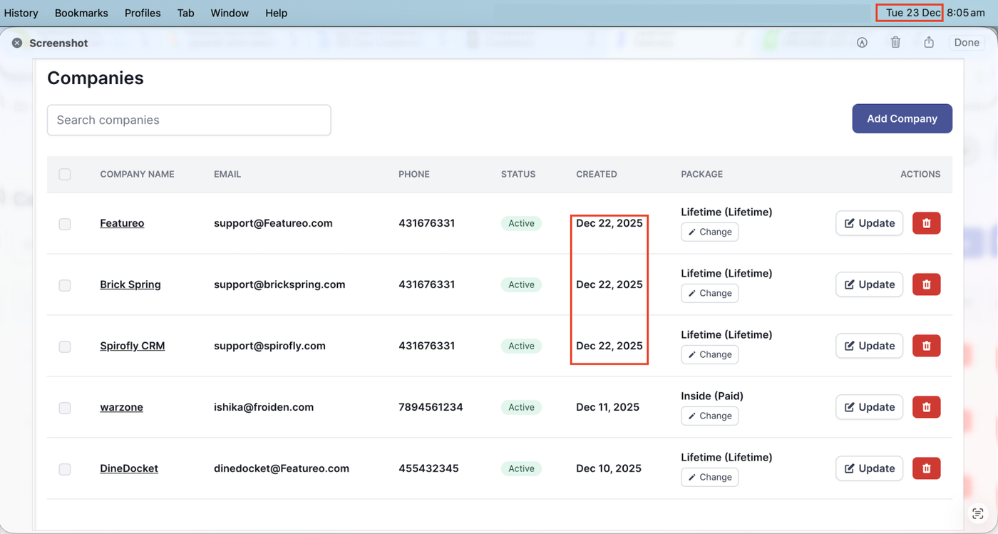 Dec 22, 2025 Dec 22, 2025 NOT FIXED 13- All company in Red area created on 23 Dec 2025, but in the system its showing 22 Dec 2025. We have already selected the main app country and time zone